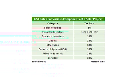 Under the GST, tax slabs are set at 5%, 12%, 18% and 28%. Solar modules will get a rate of 5%, but the government is apparently not sure how it should treat solar components and services. As per Mercom Capital Group, there may be different GST rates for various project components.