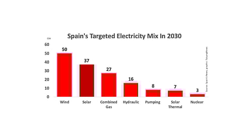 Elaborating on the government's recommendations, online news portal Spain's News reported that by 2030 total installed electricity capacity of the country is envisioned to be 157 GW, of which 50 GW will be wind power, 37 GW PV, 27 GW combined gas cycles, 16 GW hydro, 8 GW pumped storage, 7 GW solar thermal and 3 GW of nuclear power. Final closure of the coal plants will take place in 2050, it said, while nuclear energy will be phased out in chronological order.