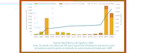 Spanish solar PV association Unión Española Fotovoltaica (UNEF) has released its annual report for the sector in 2020, claiming 3.4 GW DC was the total installed solar power capacity in the country. Even though this is less than 4.57 GW DC/3.97 AC it installed in 2019 that made it Spain's best year so far for annual solar deployments, UNEF called 2020 a historic year for the PV sector (see Spain Installs About 4.6 GW DC New Solar In 2019).