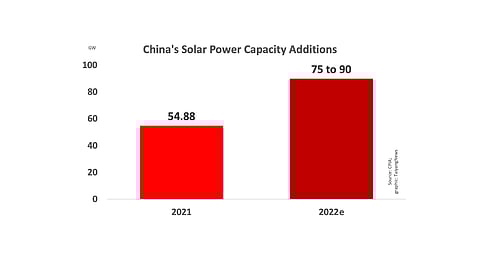 The China Photovoltaic Industry Association (CPIA) has forecast the largest solar market of the world to report annual solar PV capacity additions of 75 GW to 90 GW in 2022, accounting for 195 GW to 240 GW of global deployments this year.