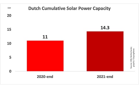 The cumulative installed solar power capacity of the Netherlands at the end of December 2021 reached 14.3 GW, according to the country's Centraal Bureau voor de Statistiek (CBS) translated as the Central Bureau of Statistics, with the addition of 3.3 GW during 2021.