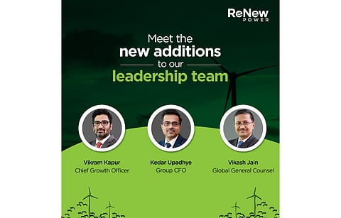Indian renewable energy company ReNew Power has announced new leadership hires, including Kedar Upadhye as the Group CFO, Vikram Kapur as Chief Growth Officer, and Vikash Jain as the General Counsel to help drive its next phase of growth.