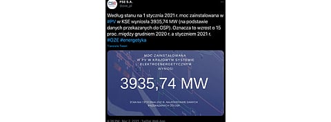 Poland is sure to have crossed 4 GW of cumulative installed solar power capacity since the country's grid operator PSE said till January 1, 2021 the aggregate had reached 3,935.74 MW. This, it added on its Twitter handle, represents an increase of 15% between December 2020 and January 2021.
