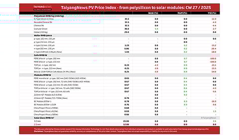 In Calendar Week 27, the TaiyangNews PV Price Index recorded movement in 2 product categories, while others held steady.