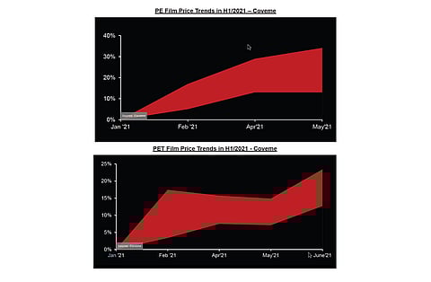 Not just the prices of PVDF, all raw material prices related to backsheet production have increased in general, albeit not to the tune of PVDF. According to Coveme, the price for PET raw materials increased in H1/2021 somewhere in the range of 15% to close to 25%, while the PE film price also increased also 15% to 35% (see graphs for reference).