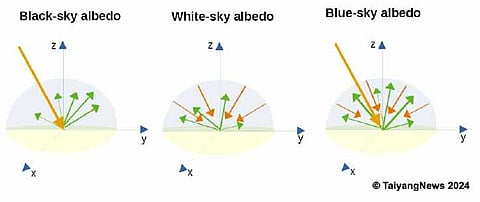 Additionally, different albedo values such as white and black-sky albedos are given (see graphic p. 20). Black-sky albedo is derived just by the reflection of direct sunlight, while white-sky albedo takes into consideration ideal diffuse radiation from skylight. The actual albedo, also called blue-sky albedo, is derived from the below mathematical expression using the black- and white-sky albedo values linked with the mixing coefficient λ.