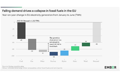Energy thinktank Ember says European Union (EU) fossil fuel power generation dropped to the lowest on record in H1/2023, producing just 33% of its power, with persistently high gas and power prices driving down electricity demand, while solar and wind production increased significantly, leading the bloc's clean energy transition.