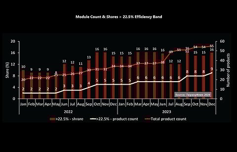 The next change took place in the last month of 2023, when not only Astronergy improved its TOPCon product range with an efficiency reaching 22.65% – the same as that of JinkoSolar's TOPCon products – but Tongwei's HJT module created ripples with 23% efficiency. Thus, by the end of 2023, a total of 9 products/companies reached the above-22.5% efficiency band.