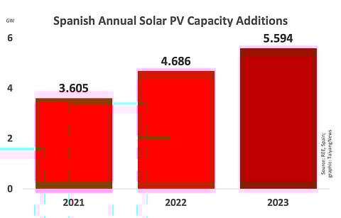 Spain grew its annual solar PV additions in the year 2023 by 28%, making it the highest number of deployments since records began, says the country's electricity grid operator Red Electrica de Espana (REE). The 5.594 GW new capacity last year improved the national cumulative to over 25.5 GW.