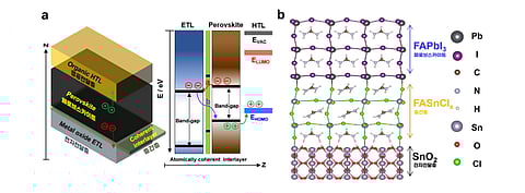 The team achieved this level by forming an interlayer between a SnO2 electron-transporting layer and a halide perovskite light-absorbing layer to minimize interfacial defects that substantially lower power conversion efficiency of the devices. They did this by coupling CI-bonded SnO2 with a CI-containing perovskite precursor.
