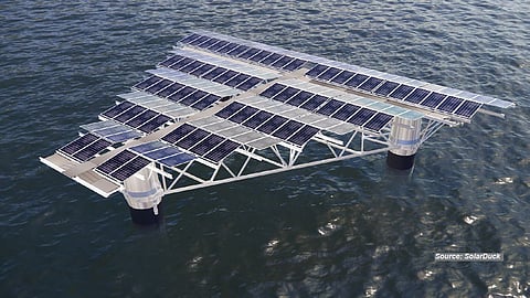 SolarDuck has developed a proprietary floating technology that resembles an offshore oil platform ,but instead of drilling for oil, it harnesses the power of the sun. The technology, called Merganser, consists of a flexibly interconnected semi-triangular structure with 3 floats each. The platforms are designed to withstand harsh offshore conditions, such as strong winds, waves, and currents. They are also modular and scalable, allowing for easy installation and expansion. The shape is considered to be effective for transiting loads. The low motions design of the platform ensures that it remains stable even in rough seas, which helps to protect the solar panels and other equipment. The optimal gap makes it collision free. The elevated walkways provide safe access for crew members to the platform, even in rough seas.