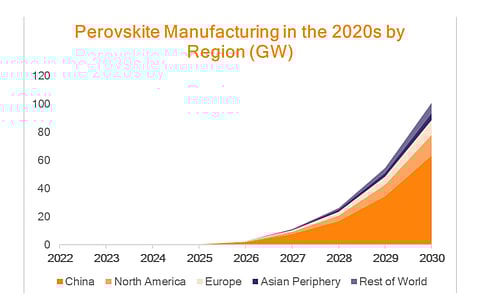 Europe will be home to a majority of global perovskite installations until 2028 and will continue to be the biggest single region until 2034 when China overtakes it.