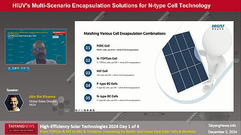 At the TaiyangNews High-Efficiency Solar Technologies 2024 Conference, Jitin Rai Khanna, Global Sales Director at HIUV, presented the company’s encapsulation strategies for various n-type cell architectures, including TOPCon, HJT, and back contact designs. He outlined the use of co-extruded EPE films featuring a reinforced POE layer to reduce lamination defects and improve anti-PID performance, as well as the introduction of an EXP variant (P507S) that lowers POE content while maintaining encapsulation function. The session also covered front and rear encapsulant combinations for mainstream cell types and recent developments targeting 0BB interconnection formats (see Advancements In TOPCon Technology: HIUV’s Encapsulants).