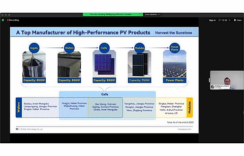 Speaking at the TaiyangNews Special Focus Webinar on TOPCon, The New State of the Art-The Versatile Technology Platform Serving Different Applications JA Solar's Director Sales, DACH, Spain and Portugal PV Power Plants, Wolfgang Löhnert said in his presentation titled "Driving Innovation Towards A Sustainable Future" that in-house vertical integration is a crucial factor for a company to ensure reliable PV modules.