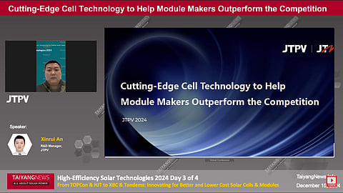 At the recent TaiyangNews Annual Flagship Conference – High-Efficiency Solar Technologies 2024 – Xinrui An, R&D Manager at JTPV, provided an overview of the latest upgraded MoNo 2 series n-type PV cell for module makers (see Jietai Solar presentation here). Jietai Solar, or JTPV, is a Chinese PV cell manufacturer with production bases in Chuzhou and Huai'an with a cumulative annual capacity of 40 GW, and offers high-efficiency n-type PV cells.