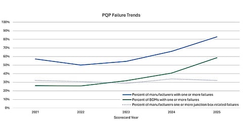 Kiwa PVEL’s 2025 Scorecard reports that 83% of tested module manufacturers had at least 1 test failure, the highest rate to date