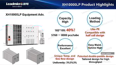 Leadmicro, a strong advocate of plasma-based deposition processes such as PECVD and PEALD, has also started offering LPCVD systems. The XH10000LP represents the company’s LPCVD offerings tailored for tunnel oxide and in-situ doped polysilicon deposition in TOPCon solar cell production. It supports a wide range of wafer sizes, from M0 to G12, and thicknesses of 130 to 220 μm.