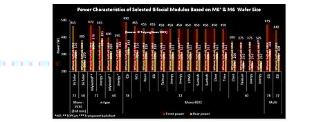 However, JA Solar is offering two modules based on a somewhat atypical size of 168 mm, which are also listed here. Within the n-type category, while Jolywood is offering TOPCon modules, Jinergy is relying on HJT cells. Both the companies are offering modules in 72 and 60-cell layout. For the larger configuration, Jolywood's TOPCon product has a labelled wattage of 470 W, while Jinergy's HJT M6 panel is rated with 465 W. However, CSI is offering the product with the largest number of cells – 78, thus its BiHiKu5, a mono-PERC module comes with the highest power rating of 490 W. The multicrystalline variant of this model has next highest power of 475 W. The 72-cell classification M6 PERC modules contains 12 products, of which one is a multi-module. The power rating of the 11 monocrystalline products falls between 465 W and 450 W. Among the 60-cell products, one is a 380 W module and three reach 375 W. The entire listing of bifacial products are based on MBB and half-cell module technology, while two of Jinergy's products employ transparent backsheet as rear cover. When it comes to bifaciality, Jinergy's HJT modules is rated with the highest bifaciality of above 85%, followed by Jolywood's TOPCon modules at 80%. All the PERC modules featured here have an average bifaciality of 70%.