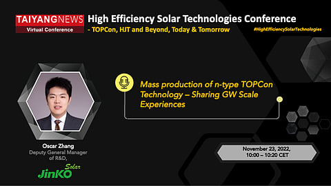 During the recent TaiyangNews Virtual Conference on High Efficiency Solar Technologies 2022 – TOPCon, HJT and Beyond, Today & Tomorrow, Oscar Zhang, Deputy General Manager of R&D JinkoSolar shared GW scale experiences of mass production of its n-type TOPCon technology that it rolls out in the form of Tiger Neo. He said that the company sees TOPCon cell production technologies as relatively mature with yield matching that of PERC.