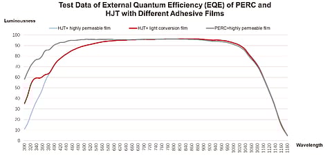 Using Cybrid's light conversion film for more than a month in a field experiment, the Chinese manufacturer was able to report ultraviolet light conversion into blue light at a wavelength of around 450mm for HJT technology.