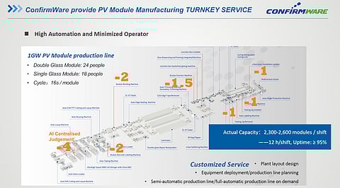 Martin Ma opened with a brief overview of ConfirmWare Technology, established in 2005. The company launched its first-generation stringer in 2012, followed by a CE & UL-certified turnkey solution in 2016. Ma emphasized the demand for highly automated production lines with minimal operators, serving customers in over 20 global regions. He cited a notable example: the company’s 1 GW turnkey line, which boasts high automation and requires only 24 operators for double-glass modules and 18 for single-glass modules, delivering a module every 16 seconds. With over 95% uptime, this line has a production capacity of 2,300 to 2,600 modules per 12-hour shift.