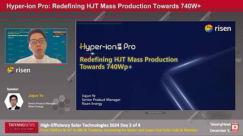 Jiajun Ye, Senior Product Manager at Risen Energy, presented the technological advancements from last year integrated into the latest HJT module at TaiyangNews' annual flagship conference – High-Efficiency Solar Technologies 2024 (see Risen Energy's presentation here).