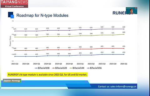 Plans to progress: Runergy, a well-known cell vendor, has ventured into the module business with a clear roadmap. For its n-type modules, the company expects to reach a power rating of 600 W for a 144 halfcell module configuration. (Source: Runergy)