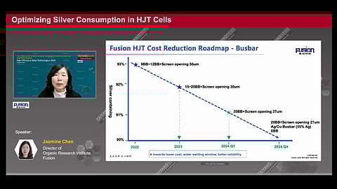 The finger provides yet another avenue for optimization, which is reducing the width, and is directly proportional to paste usage and costs. According to Fusion, between 2022 and 2024, silver consumption in HJT cells remained higher than in TOPCon. Between 2022 and 2024, screen opening widths were reduced from 22 μm to 14 μm. As a result, silver consumption decreased from 21 mg/W to 11 mg/W, though still slightly above TOPCon levels. Risen puts silver consumption at 10 mg/W in 2023, also using silver-coated copper.