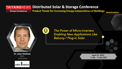 Speaking at the TaiyangNews Virtual Conference on Distributed Solar & Storage 2023, Solarnative CEO Julian Mattheis talked about the power of microinverters enabling new applications like balcony/plug-in solar or solar fences. He said its new product can turn every single solar module into an AC panel, giving it a plug-and-play feature, thus making installations easier. The Solarnative microinverters work as an individual inverter in the form of a power stick, controlling each panel independently and can be fitted into the module frame (see Compact Micro-Inverter From Solarnative). This feature helps bring down the cost of an installation. Mattheis also said this can solve the problems installers face which he sees as a major bottleneck for Germany to grow its solar capacity. Solarnative, a German start-up, is currently ramping up its first manufacturing facility close to Frankfurt/Main in Germany. To watch Julian's presentation click on the photo.