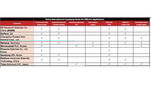 Different pastes makers are offering various pastes compositions suitable for the above-mentioned applications. A total of 9 pastes suppliers have responded to our enquiry and provided data for 111 pastes models. The above table (main picture) provides an overview of applications supported these 9 pastes makers by offering supportive products. Pastes for PERC front contacts are the applications that are in the main focus of the majority of the paste makers.