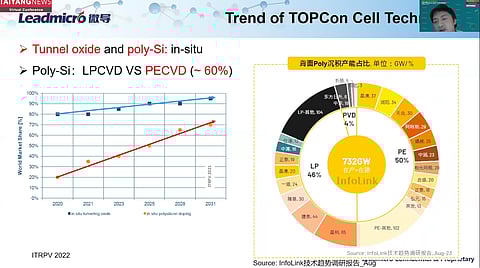 However, as mentioned above, the crux of the TOPCon process is rear passivation for which PECVD and LPCVD are the mainstream technologies. While the former is a thermal process, PECVD not only supports lower deposition temperatures, it also seamlessly integrates the doping of the applied polysilicon layer simultaneously (in-situ). This ease of process integration is facilitating the rapid adoption of PECVD, a trend also confirmed by ITRPV's 2021 roadmap, according to Liao. He further substantiates the increasing popularity of PECVD, which conquered a 50% market share, quoting PV InfoLink's August 2023 market share data for various deposition tools.