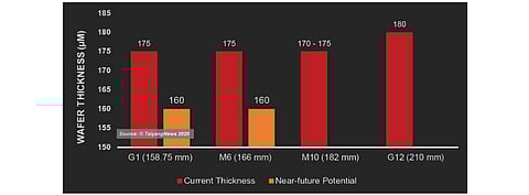 Wafer thickness not only influences cost but also the wafer size. According to LONGi, the largest monocrystalline wafer supplier, both G1 and M6 wafers are typically supplied with 175 µm thickness, which is expected to decrease further to 160 µm in the coming years. A few cell manufacturers are already considered to be thinning down their products to 170 µm. As for 182 mm wafers, the thickness is between 170 to 175 µm, while for the 210 mm format, cell producers currently prefer 180 µm thickness, according to LONGi.