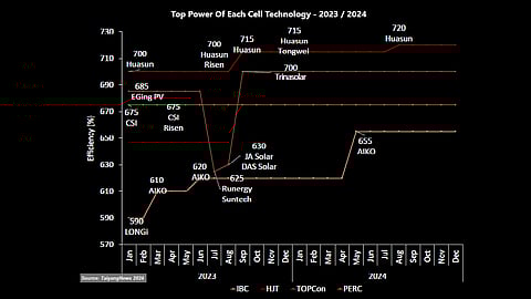 TOPCon technology represents the second-highest power rating. However, there was no change with respect to top power in this technology stream in 2024. Trinasolar’s 700 W TOPCon module was the leader throughout the year. The story was a little different in 2023, with several ups and downs. EGing PV’s TOPCon module was at the top at the beginning of 2023 with a 685 W power rating and retained its lead till June 2023. In July, as EGing PV reduced its module power to 580 W, the modules with the next highest rated power, the 625 W modules from Runergy and Suntech in this case, took the shared top spot. In August 2023, DAS Solar and JA Solar surpassed this by introducing modules with 630 W power, holding the top spot just for that month. In September, Trinasolar commercialized its TOPCon module with a power rating of 700 W, setting a new record for the technology. This 700 W power rating has remained the highest in the TOPCon category through December 2024.