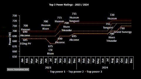 Huasun claimed the top spot in 2024 with its 720 W HJT module, followed closely by Tongwei at 715 W