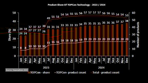 TOPCon started 2024 with 18 products and a 33% share, rising to 20 products and 35% by March, and ended the year with a 38% share due to a reduced total number of products