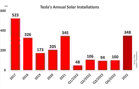 The annual total of 348 MW, just 1% above 345 MW it reported for 2021, came about 'despite supply chain challenges' (see Tesla Deployed 345 MW Solar In 2021).