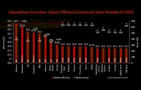 Before going into the details, a bit of background on the methodology and selection criteria. Since module efficiencies have been improving considerably, more than 0.5% average per year, to make the list rewarding for technically advanced products we put the benchmark efficiency at 21.5%. We have listed only commercially available top modules from each cell technology stream of one module maker. For example, if a company is offering 2 different product streams based on PERC technology that have more than 21.5% efficiency, then only the product with the higher efficiency is considered for this list. But if a module maker is offering, for example, products based on PERC and TOPCon that have efficiencies of 21.5% or above, then both the products are listed here.