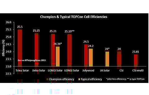 The race among the mainstream PV manufacturers has actually been an interesting one, with a series of performance records announced since the end of last year. Trina Solar, one of the early adopters of the technology, is still holding the best performance figure 25.5%, but was also first among the top companies to held the world record efficiency of 24.58% from May 2019 till July 2020, to be surpassed by JinkoSolar's 24.79%. It didn't take long for JinkoSolar to break its own record, hitting 24.9% in the beginning of January 2021. LONGi, a strong proponent of p-type PERC, announced in April 2021 that it broke the 25% barrier by achieving 25.09% for its 242.77 cm2 TOPCon cell technology called HPC (see LONGi Reports 25.09% N-type TOPCon Cell Efficiency). In June, just about 2 months later, JinkoSolar regained the spot by announcing an efficiency of 25.25%. Close, but no cigar — LONGi announced the very next day that it had achieved 25.21%, falling short by a mere 0.04%, while the average pilot run efficiency is at 24.34%. Not just setting up the record, JinkoSolar has also increased its commercial activities with TOPCon, reaching 24.15% efficiency in mass production, as indicated at the TaiyangNews virtual conference on Very High Power Solar Modules. JA Solar is yet another mainstream top tier company that is also evaluating TOPCon. The company is currently in the pilot phase with an average efficiency of above 24%. However, very recently (after we published our TOPCon report), in late March 2022, Trina Solar announced its latest world record of 25.5%, which till date is the highest, and is attained on a G12 wafer format (see JinkoSolar: 24.9% Efficiency Record For TOPCon Solar Cell).