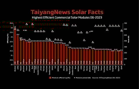 The top products from JA Solar and TW Solar which joined the list in April 2023 have remained unchanged. The JAM72D40 580/GB, a TOPCon product from JA Solar has 22.5% efficiency for a power output of 580 W. TW Solar's TOPCon product has exactly the same efficiency and power ratings of 22.5% and 580 W, respectively, thus both are sharing the rank. Both the products are built with 144 half cells using G12 wafer format.