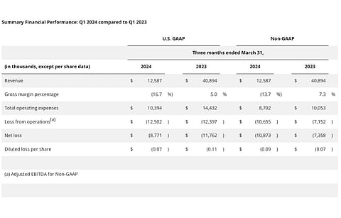 The management guides for its Q2/2024 revenues at the mid-point to be slightly up from the 1st quarter within the range of $10.5 million to $15.5 million. Adjusted EBITDA is expected to be in the range of -$12.6 million to -$9.8 million.